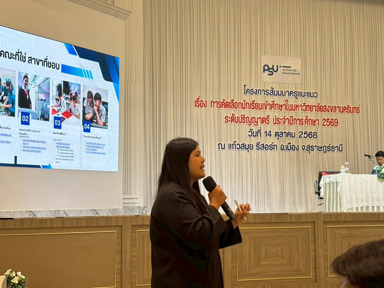 ศูนย์รับนักศึกษาและการทดสอบ สำนักการศึกษาและนวัตกรรมการเรียนรู้ มหาวิทยาลัยสงขลานครินทร์ จัดสัมมนาโครงการสัมมนาครูแนะแนว ครั้งที่ 6 ในระหว่างวันที่ 14 – 16 ตุลาคม 2568 ณ โรงแรมแก้วสมุยรีสอร์ท จ.สุราษฎร์ธานี โรงแรมคริสตัล หาดใหญ่ จ.สงขลา และโรงแรมซี เอส จ.ปัตตานี ที่ผ่านมานั้น โดยมีผู้เข้าร่วมสัมมนา จำนวน 456 คน ประกอบด้วยคุณครูแนะแนวจากโรงเรียนต่างๆ ใน 14 จังหวัดภาคใต้ รวมทั้ง ผู้บริหารของคณะ/สาขาวิชา และผู้ประสานงานของวิทยาเขตต่างๆ ทั้ง 5 วิทยาเขต